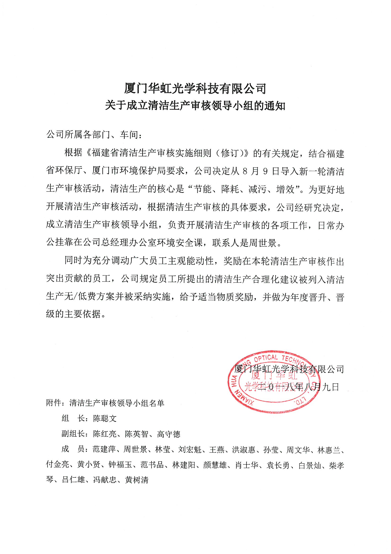 廈門(mén)華虹光學(xué)科技有限公司關(guān)于成立清潔生產(chǎn)審核領(lǐng)導小組的通知