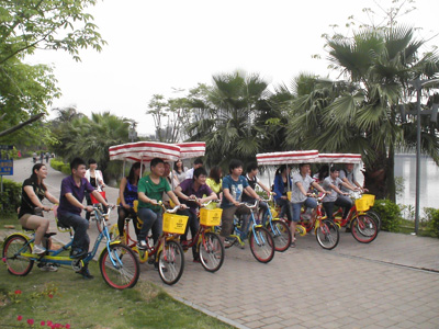 最后進(jìn)行的多人自行車(chē)比賽把活動(dòng)帶入激情時(shí)刻,每位男生都在漂亮的女生面前奮力向前。一排排的綠樹(shù)間,飛馳的自行車(chē)載著(zhù)甜美的笑聲穿梭而過(guò);蜿蜒的木棧道上,車(chē)輪的噠噠聲好像在鞭策每一位青年不要停下前進(jìn)的腳步,勇于面對困難,敢于大膽創(chuàng )新,勝利一定會(huì )來(lái)到,美好的明天一定會(huì )來(lái)到!